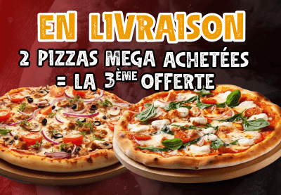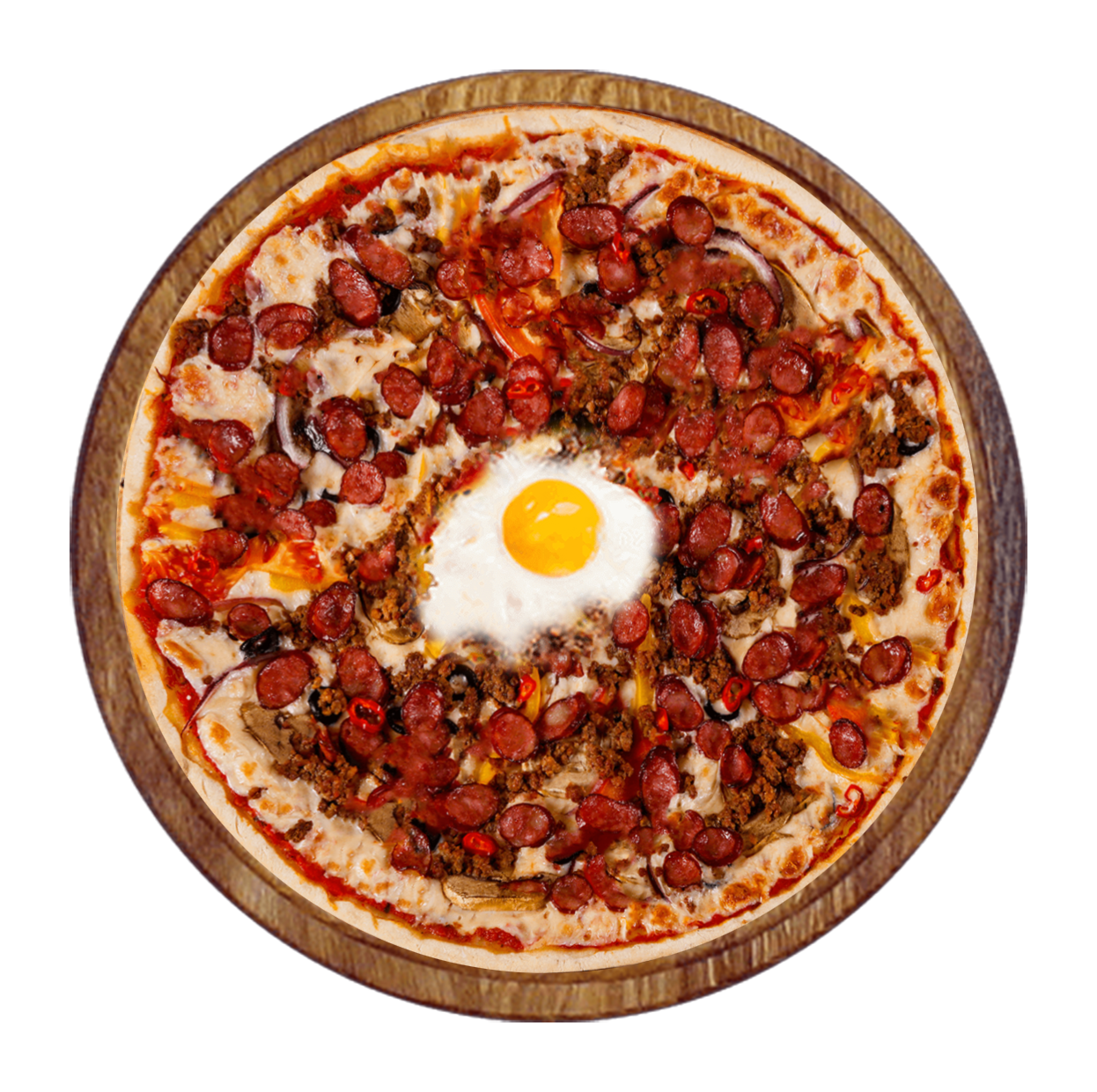 Sauce tomate, mozzarella, jambon, pepperoni, oeuf, merguez, champignons.