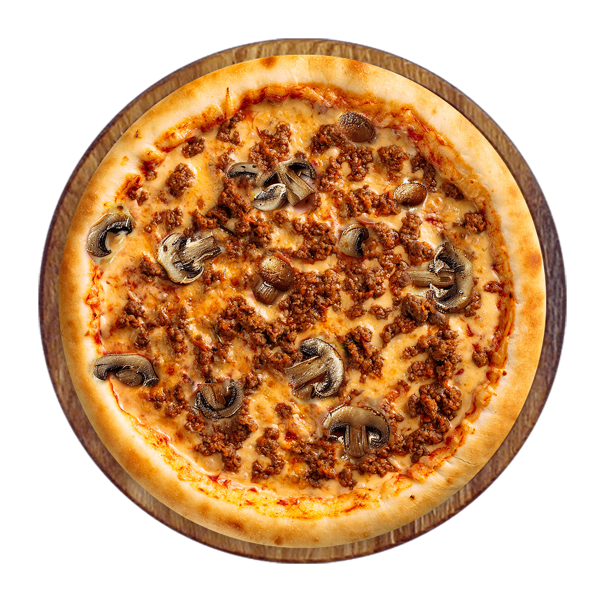 Sauce tomate, mozzarella, viande hachée, champignons.