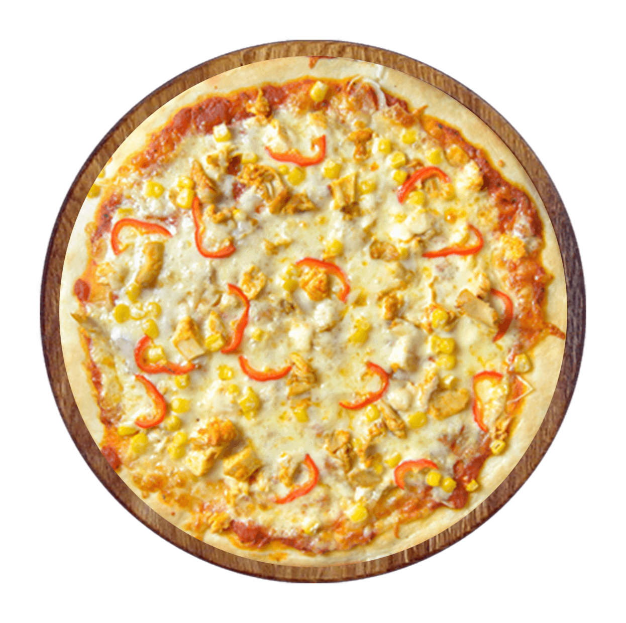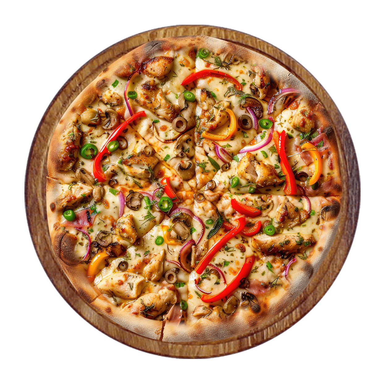 Sauce tomate, mozzarella, poulet, poivrons, champignons.