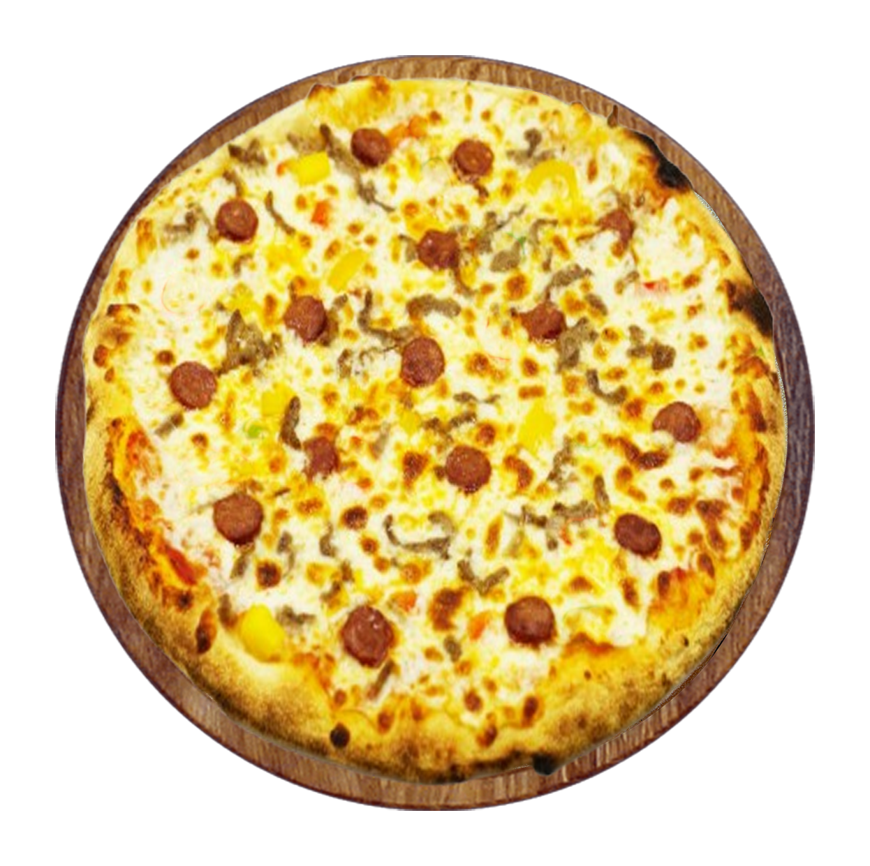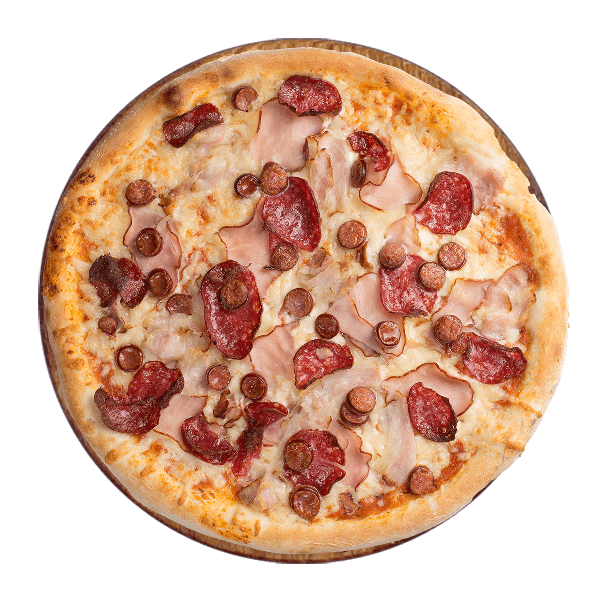 Sauce tomate, mozzarella, jambon, pepperoni, bacon.