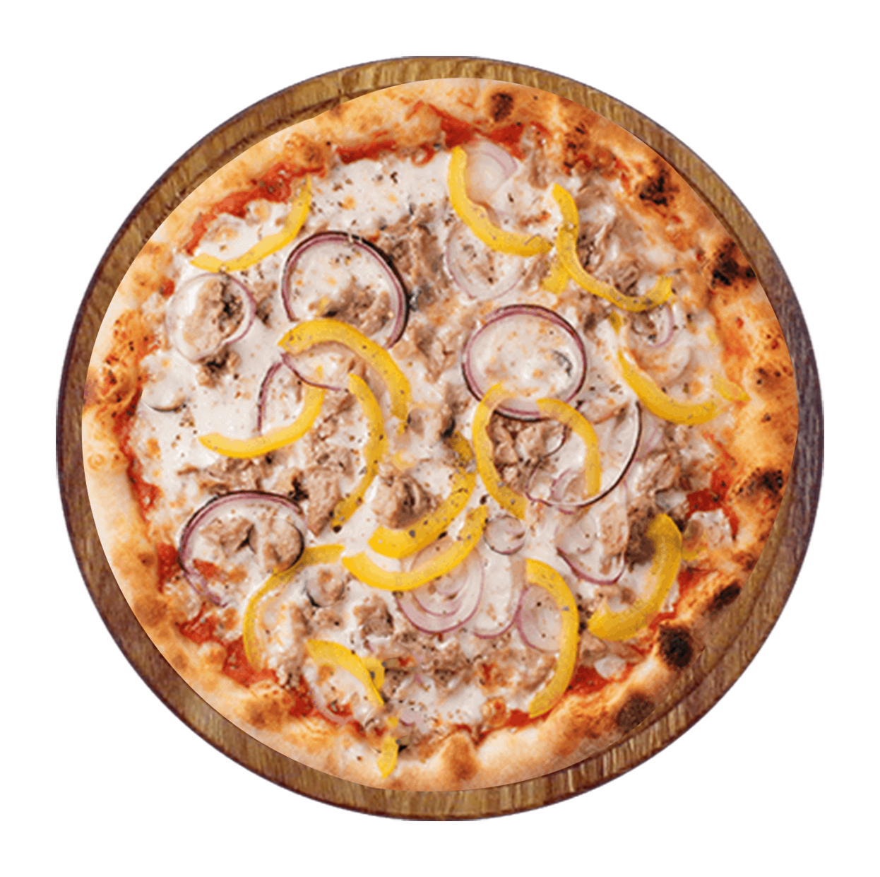 Sauce tomate, mozzarella, thon, poivrons, oignons, tomates fraîches.