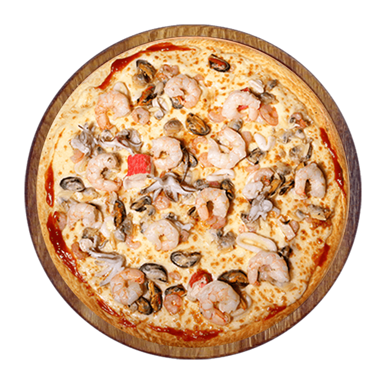 Sauce tomate, mozzarella, ail, persil, cocktail de fruits de mer (calamars, moules, crevettes).