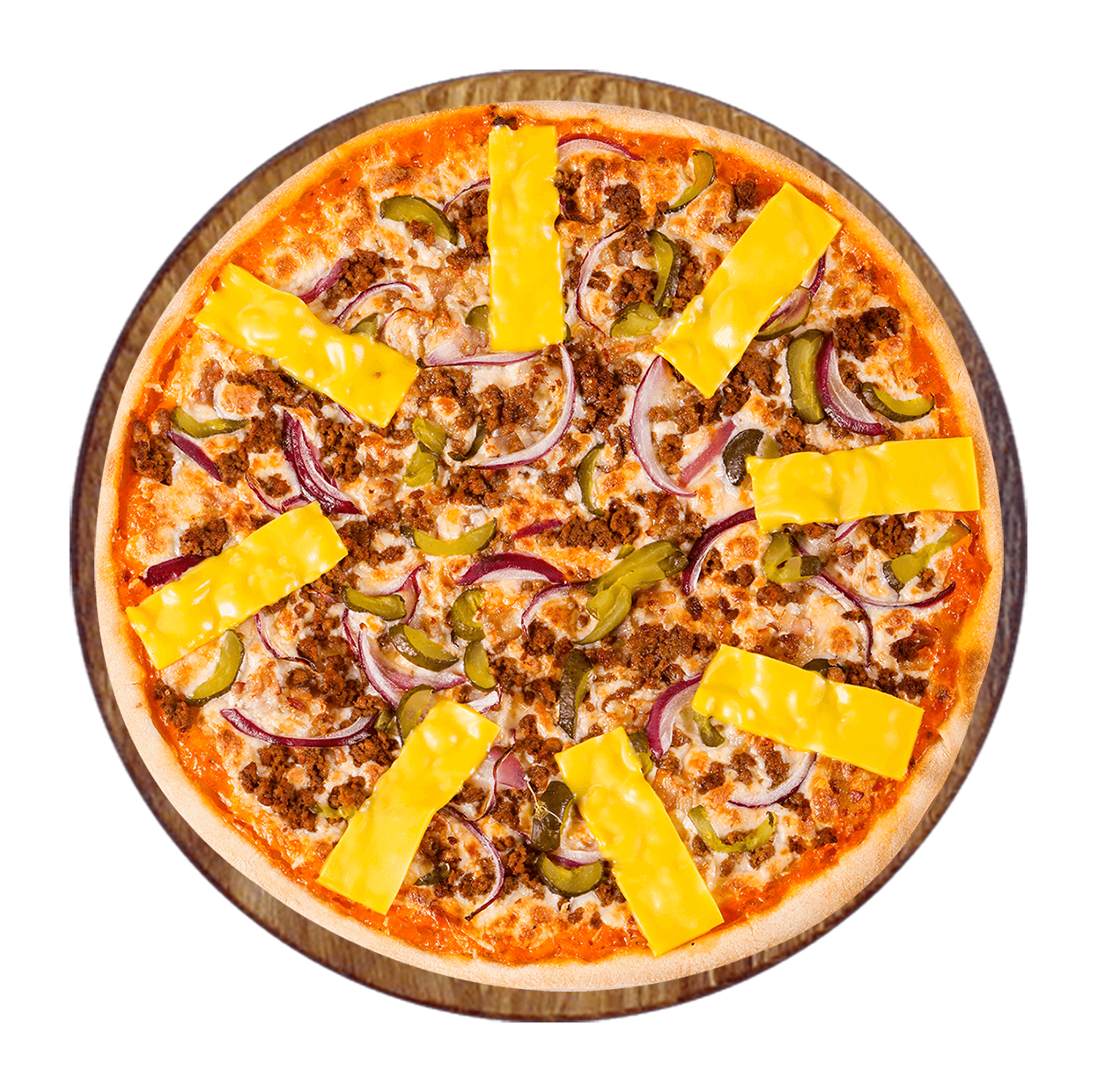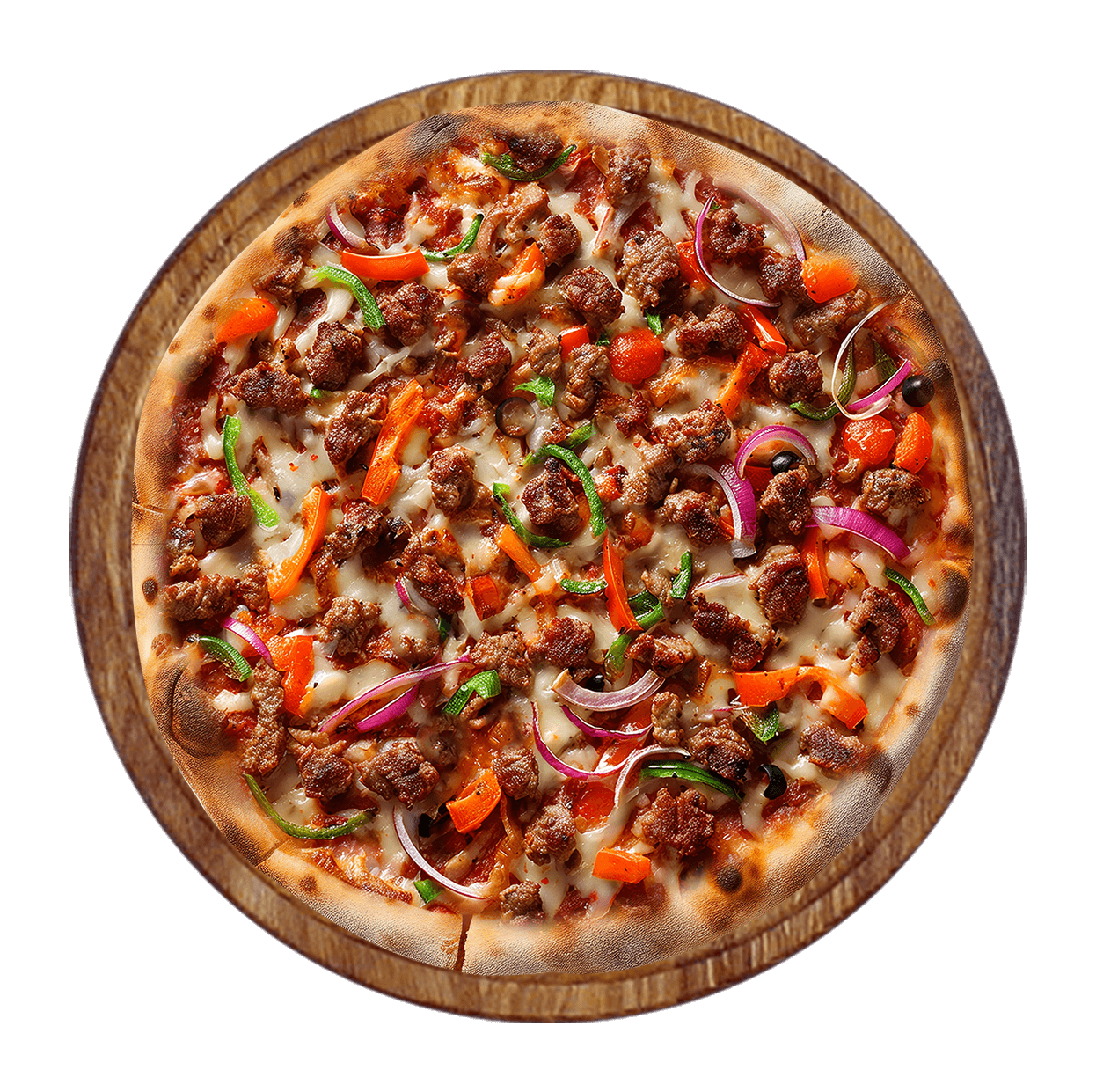 Sauce tomate, mozzarella, viande hachée, pepperoni, oignons.