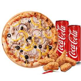 1 Pizza Super au choix + 6 Chicken wings + 2 Coca cola 33cl.